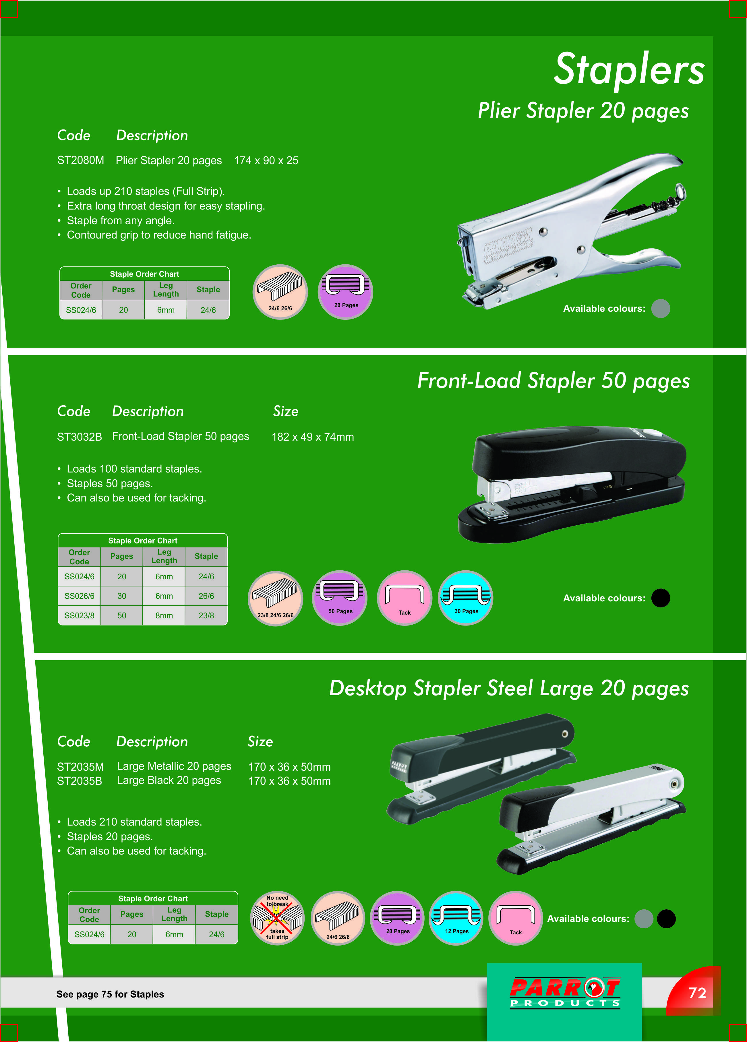 Loads 100 standard staples. Staples 50 pages. Can also be used for tacking. For office and home use. Durable and high quality. Throat depth adjustment.